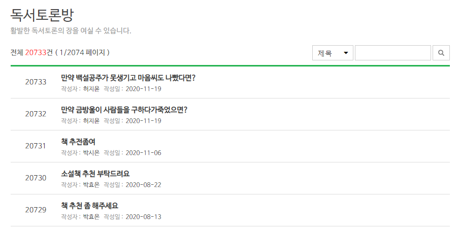 읽은 도서에 관한 자신의 생각과 다른 친구들과 의견을 공유할 수 있는 독서토론방입니다