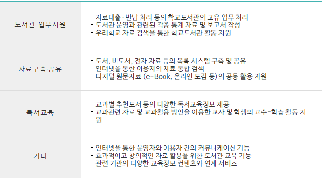 교육청 관내에서 개별 학교 도서관의 도서관리업무를 자동화하는 서비스 체제입니다