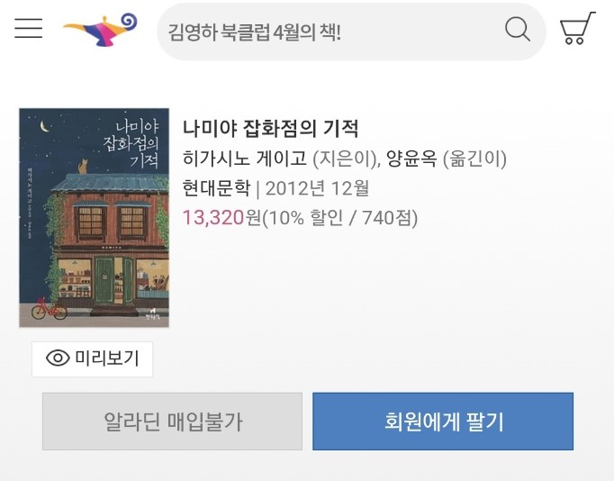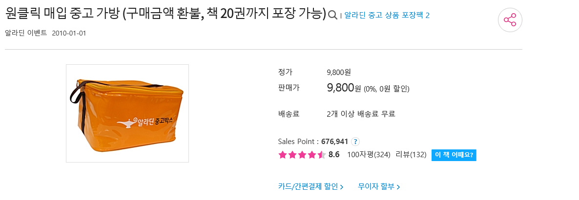 이런 식으로 정가와 판매가 그리고 제일 중요한 알라딘 중고서점에서의 매입가가 나옵니다.