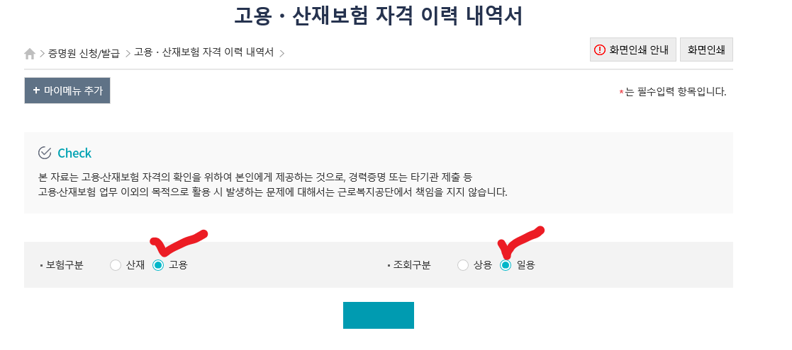 체크 란에서 "고용" "일용" 체크 후 조회하기를 누릅니다.