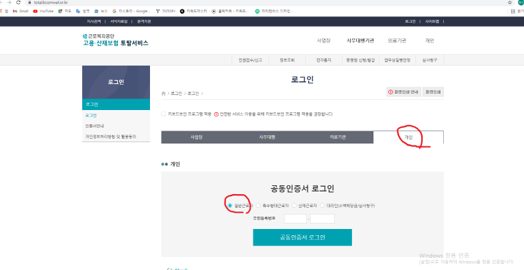 로그인 화면에서 "개인"으로 들어간 후 일반 근로자 선택 후 공인인증서 로그인