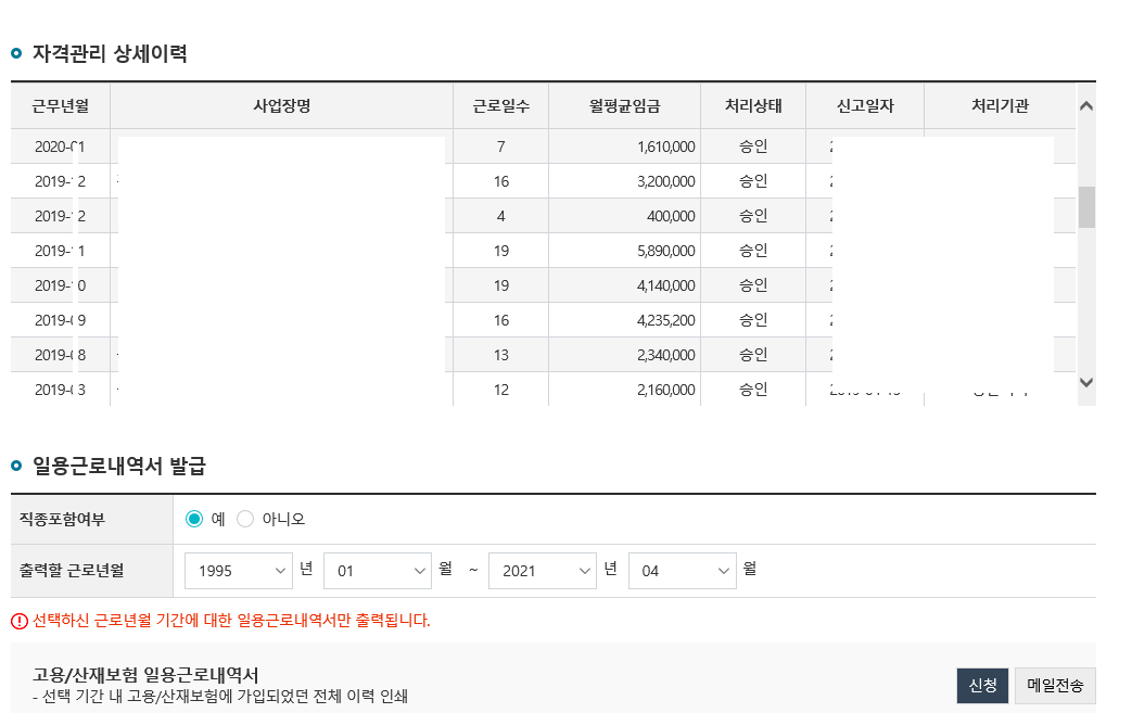조회를 하면 근무한 날짜, 사업장명, 근로일수, 월평균 임금 등이 나오며 메일로 받거나 인쇄할 수 있습니다.