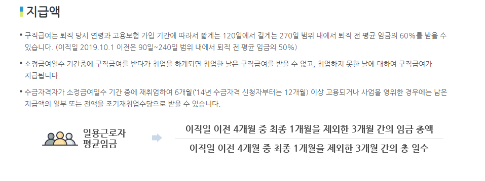 이러한 경우 즉, "어떤 현장에서 일주일 고용보험에 가입을 했고 시간이 지나 다른 현장에서 며칠 가입했고"이 같은 경우에도 똑같은 지급액 기준이 적용되는지 궁금증이 생겨 문의해보았습니다.문의 결과 평균임금과 평균일 수를 산정하기에 똑같이 적용된다는 답변을 받았습니다.즉 일용직 근로자의 실업급여 지급액은 본인이 그 시기에 일을 많이 했던 적게 했던그 3개월에 공식적으로 고용보험에 가입된 내용으로 지급액이 산정됩니다.정확한 지급액은 개개인이 다 틀리므로 일용직 실업급여 신청 자격이 되는 분은 사이트에 급여액 계산기를 이용하거나 고용센터에 방문해서 상담받는 것이 좋을 것 같습니다.