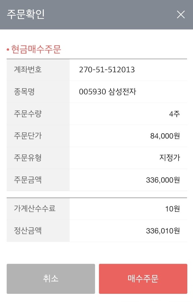 현금매수 주문을 다시 한번 확인하는 창입니다.