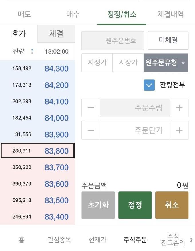 매도나 매수 주문을 취소나 정정하려면 화면 중간에 있는 미체결 항목으로 들어가서 정정 취소합니다.매도주문이나 매수주문 후 정정이 안 되는 경우는 그 주문이 이미 체결되었기에 미체결 목록에 없는 겁니다.