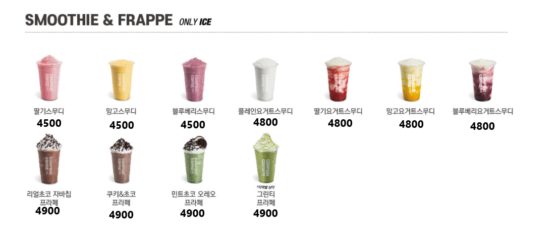 많은 분들이 부담 없이 즐길 수 있게 가격도 맛도 메뉴도 다양한 컴포즈 커피입니다.