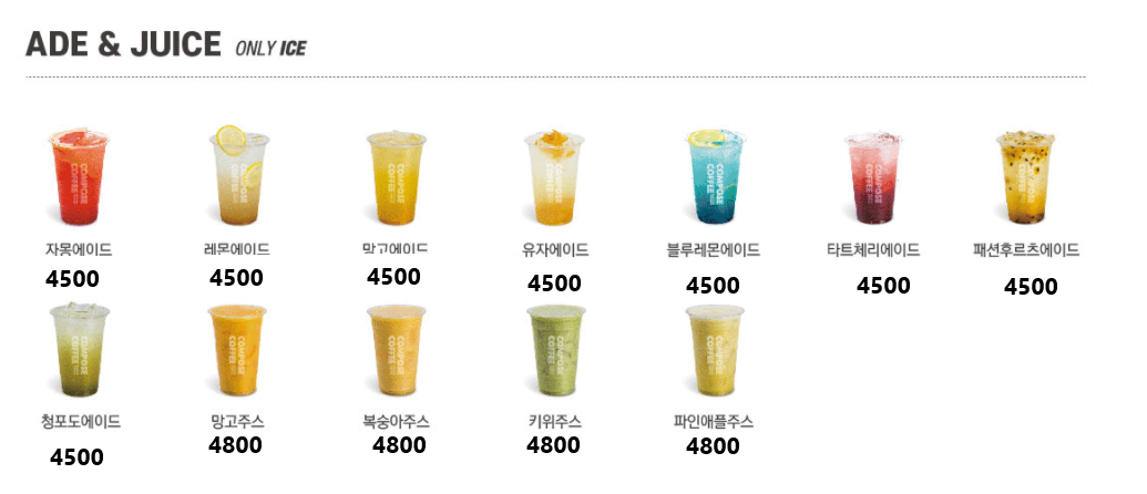 주로 음주 다음 날. 숙취용으로 자주 마신 컴포즈 커피 메뉴 에이드와 주스류입니다.