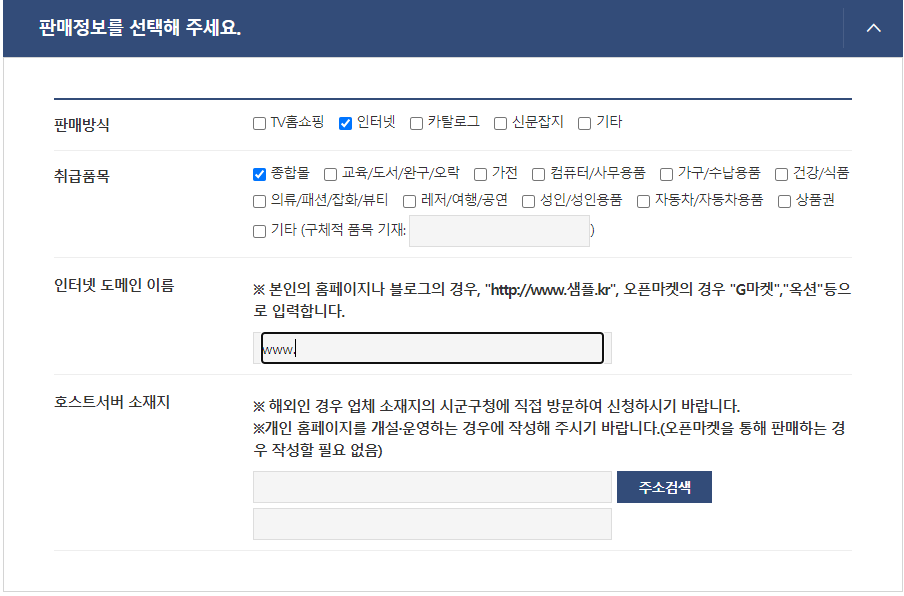 판매방식과 취급품목은 본인에게 맞게 선택해줍니다. 크게 중요한 사항은 아닙니다.